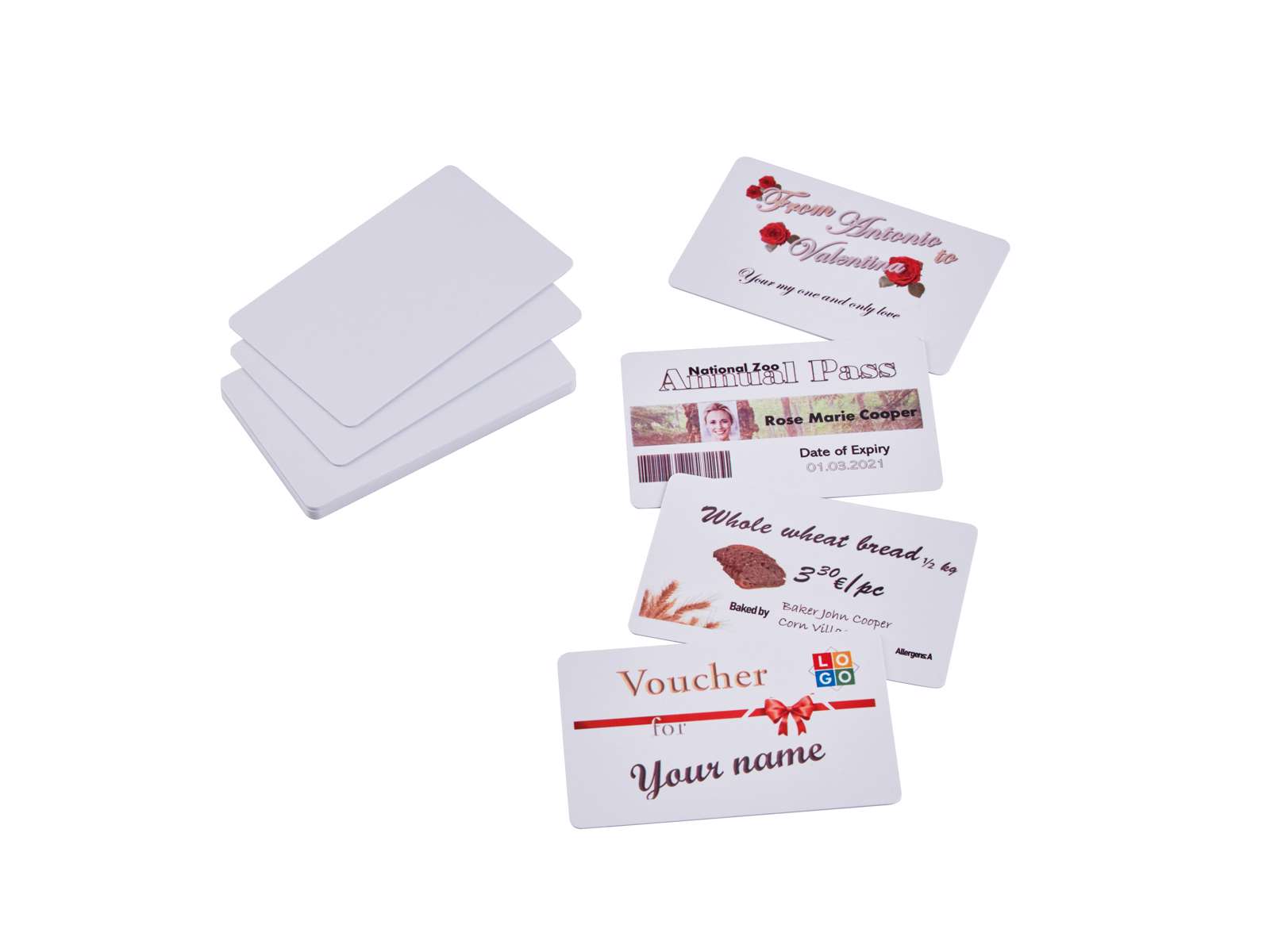 Medlemskort, sæsonkort, studiekort, gæstekort, adgangskort, ID-kort, tjekk et visitkort osv.
