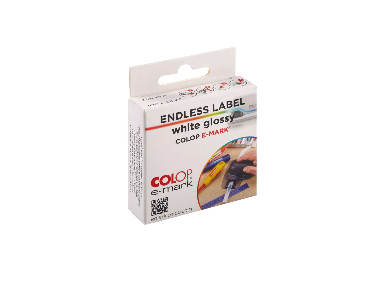 1 stk. æske med 8 meter lang label strimmel, 14 mm høj - lav nemt dine egen label med dit E-mark stempel.