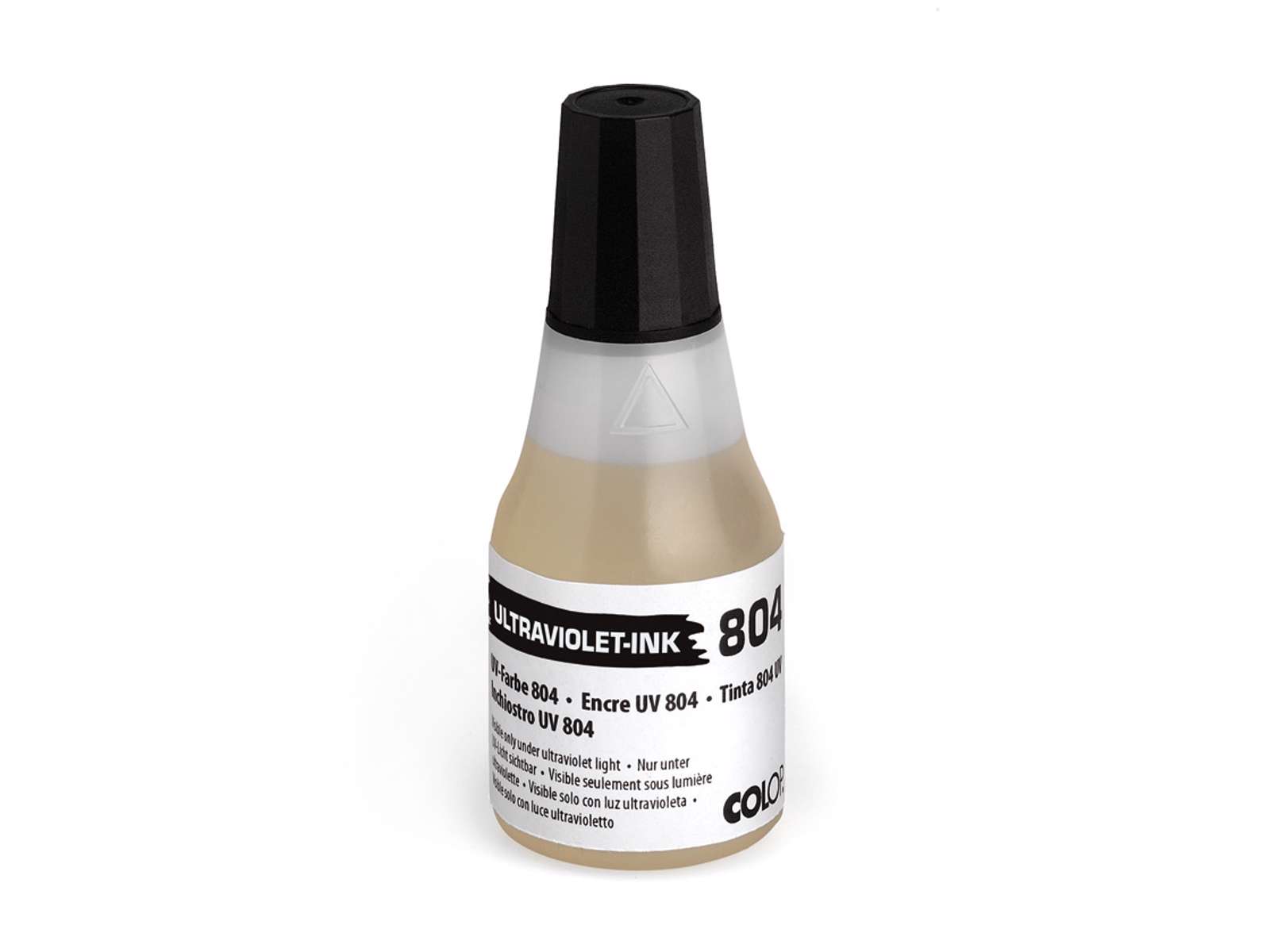 Stempelfarve UV 804 leveres i 25ml flaske. Ultraviolet farve, synlig i UV lys. Indfarves nemt i alle farvepuder ikke mindst til Colop kontrolstempel R12. Farven er vandbaseret og bliver brugt som indgangsstempel til diskoteker, tørretid på hud ca. 10 sekunder. 804 UV farven er Dermatological testet på menneske skin, og er godkendt.